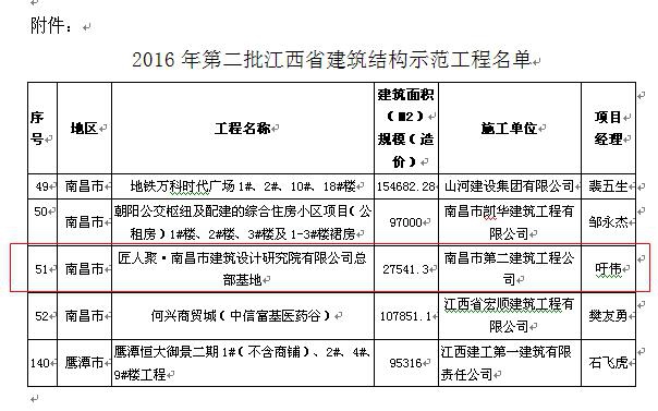 【概要描述】 公司匠人聚?南昌市建筑設(shè)計研究院有限公司總部基地工地榮獲2016年第二批江西省建筑結(jié)構(gòu)示范工程稱號